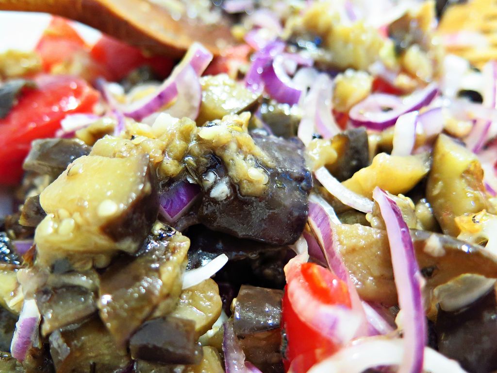 ОтветитьУдалитьЧасто делаю салат: помидоры черри, красный лук, соль, сахар, масло. А тут у тебя еще жареный баклажан и сметанц... надо будет сделать, один баклажан есть в холодильнике.